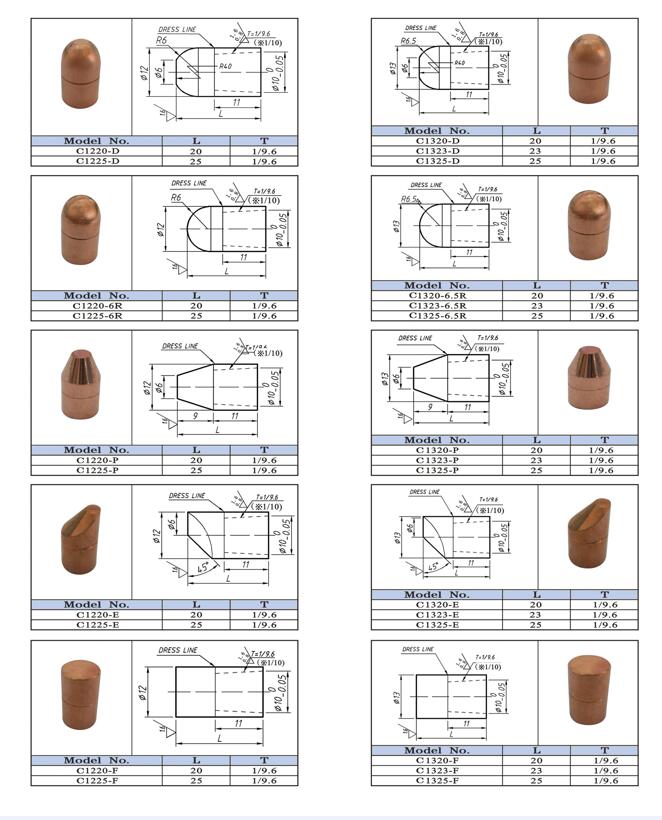 3) 铬锆铜电极适用于碳钢板、不锈钢板、镀层板等零件的点焊与凸焊,铬锆铜材料适合于制造电极帽、电极连杆、电极头、电极握杆、凸焊特殊电极、滚焊轮、导电嘴等电极零件。